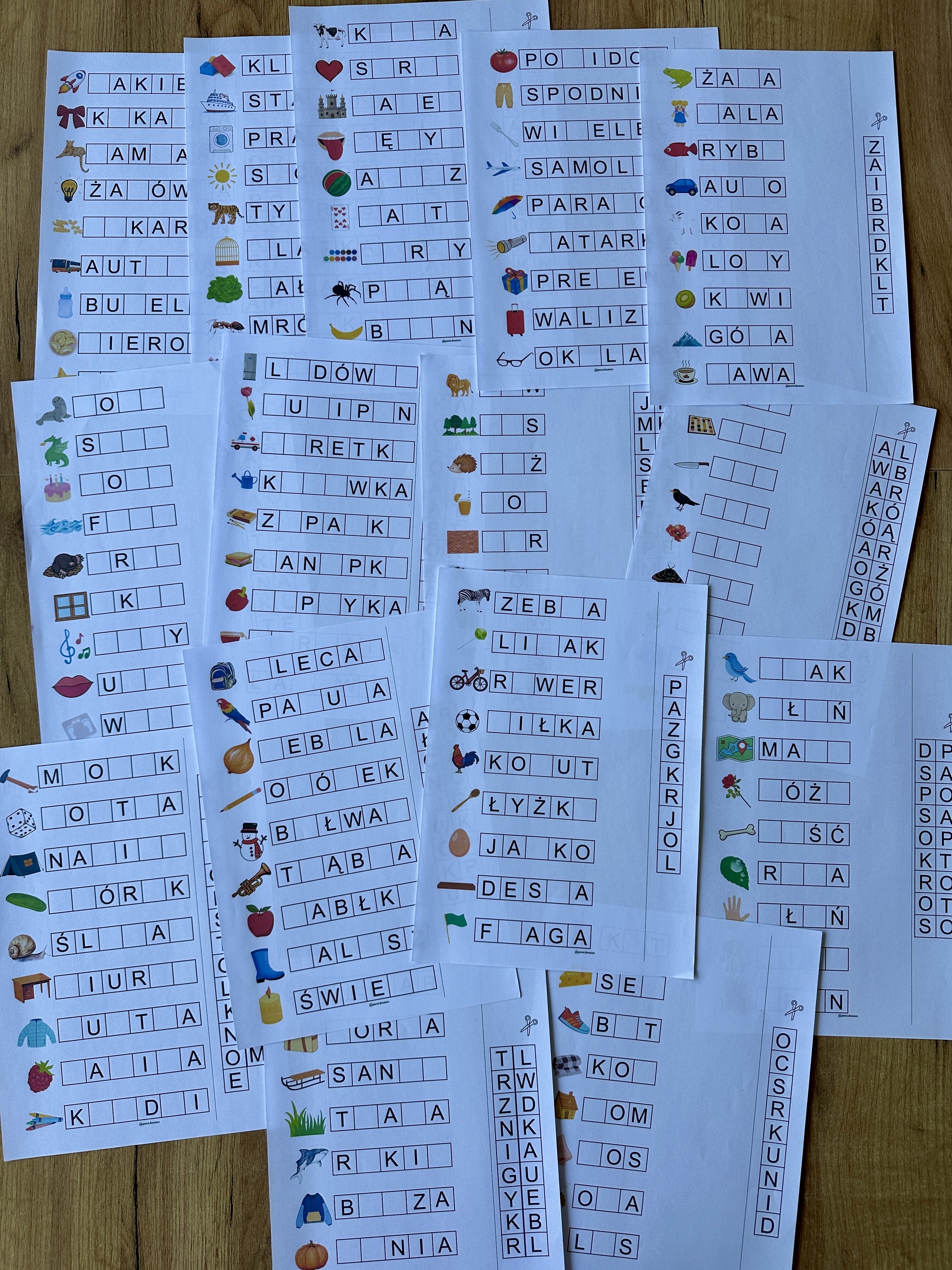 Każda karta zawiera 9 obrazków z podpisami, w których brakuje od 1 do 3 liter. Brakujące litery znajdują się z prawej strony karty.