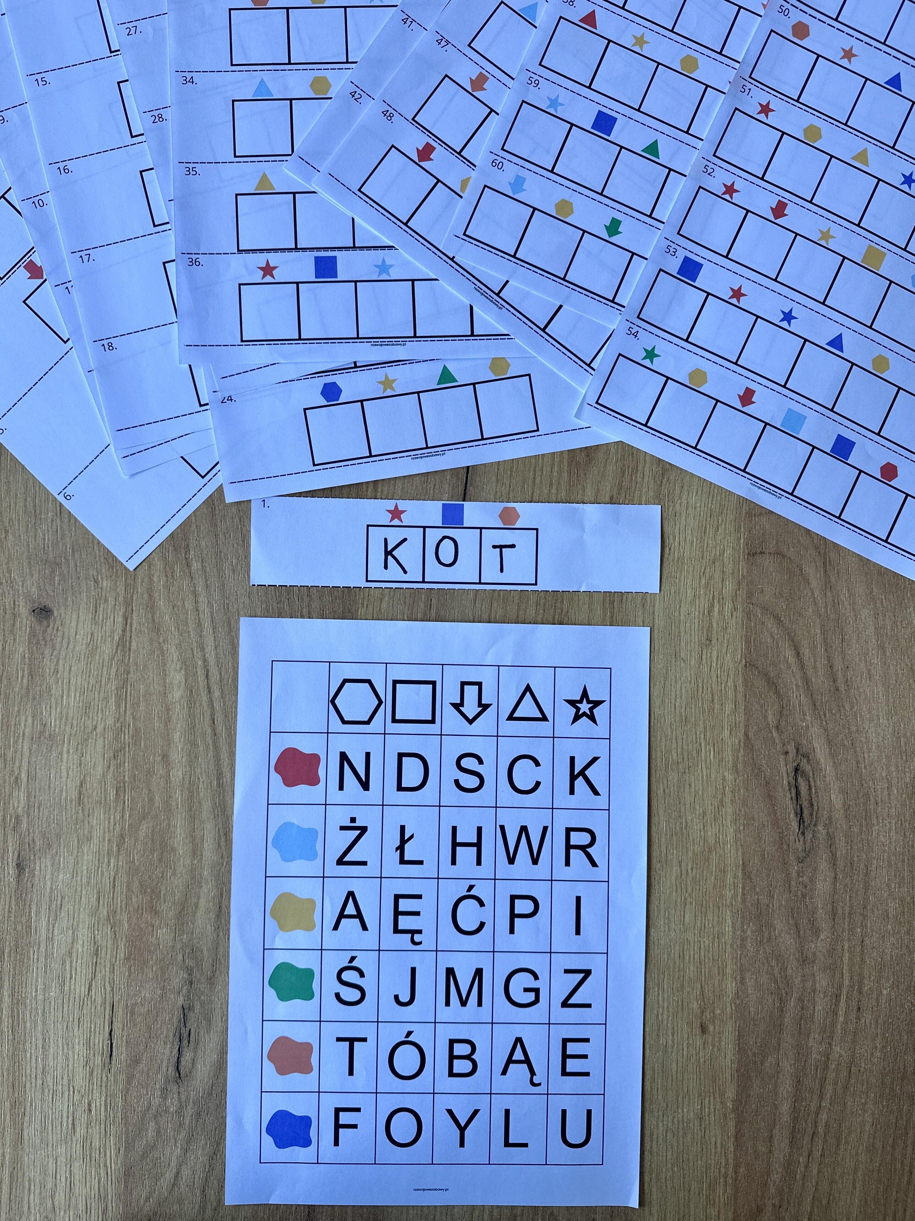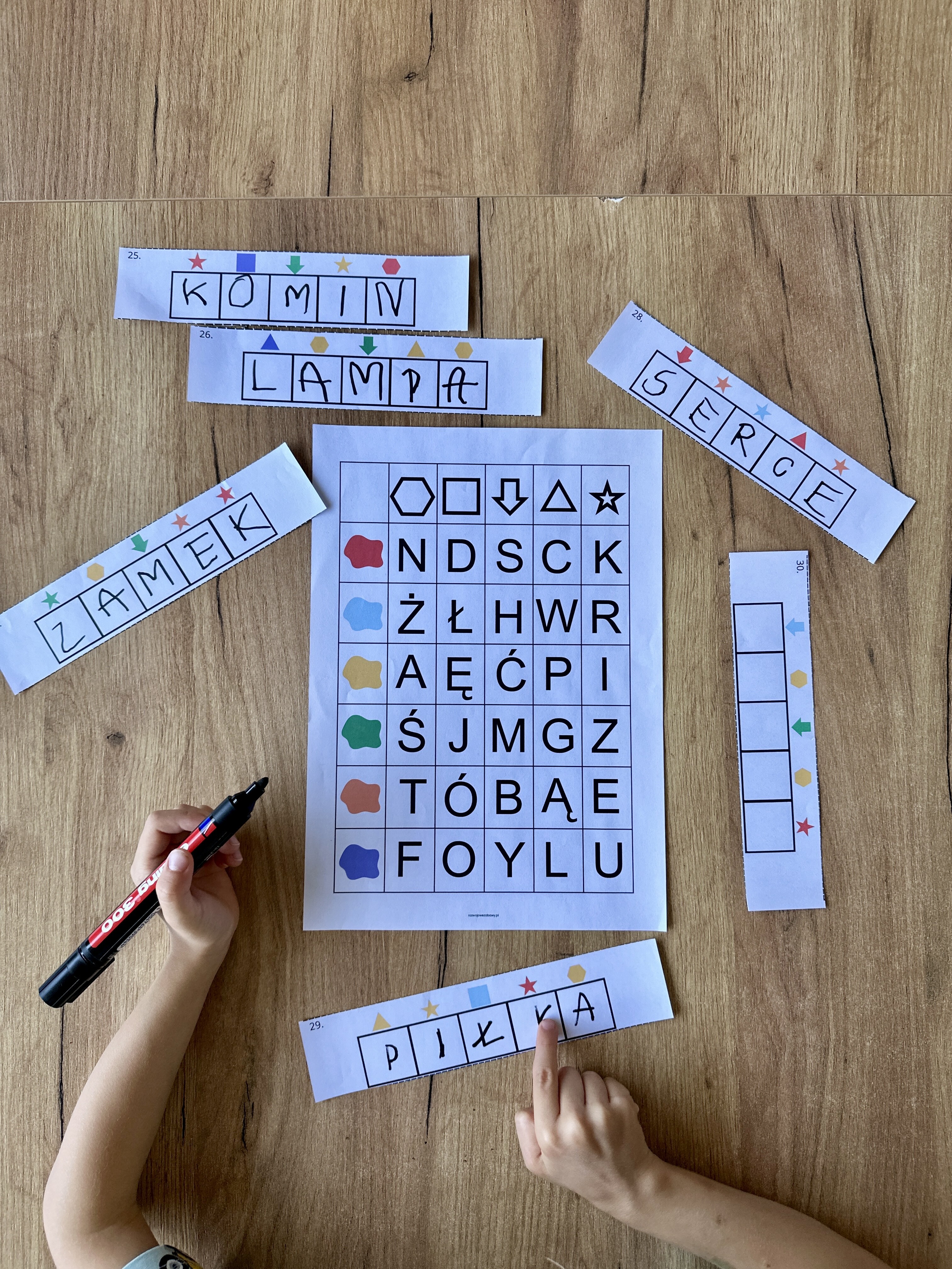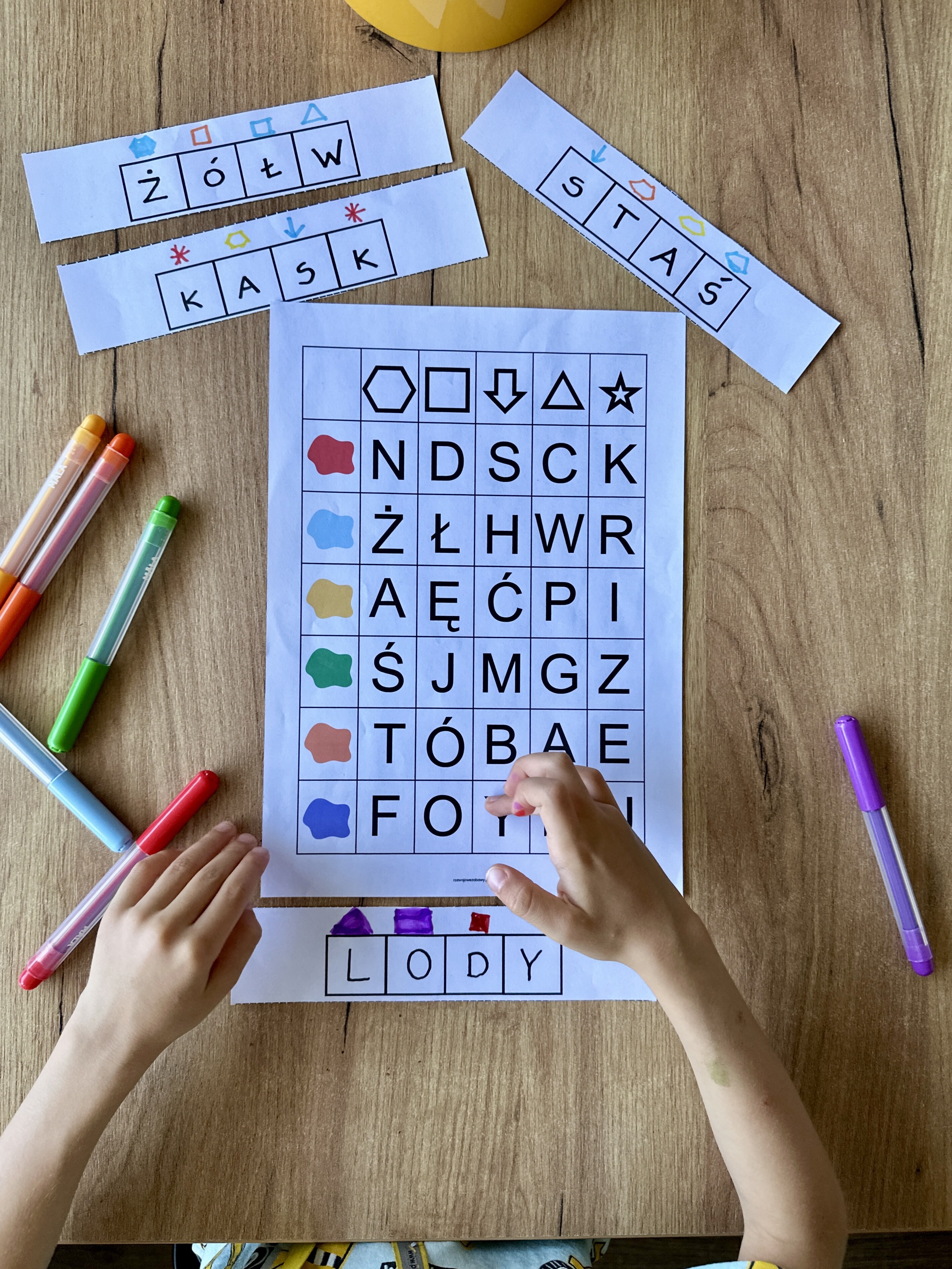 Dziecko rozszyfrowuje zakodowane słowa, odczytując symbole z tabeli kodów, w której każdej literze przypisany jest konkretny kształt i kolor. To nie tylko świetna zabawa, ale również skuteczna forma nauki przez działanie.